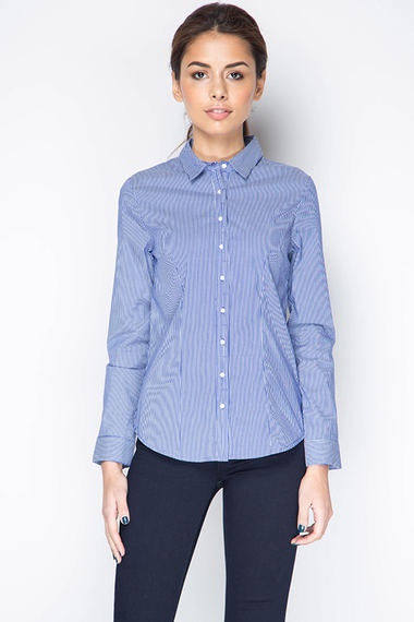 Классическая модель блузки с длинным рукавом и принтом в мелкую синюю полоску. Блузка приталенного кроя, с классическим рубашечным воротником.
