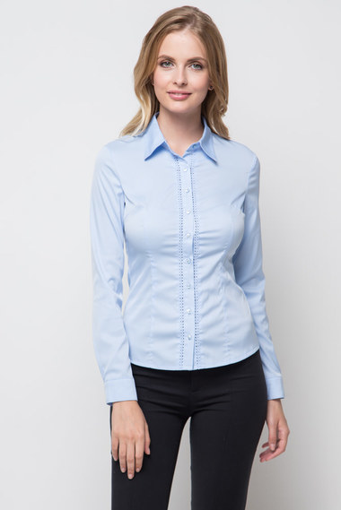 Деловая блузанебесно-голубого цвета с классическим воротником. Вдоль талии расположены вертикальныевытачки, передняя полочка обработана перворацией.